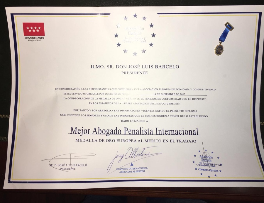 MEDALLA DE ORO al Mérito Humanitario "MEJOR ABOGADO PENALISTA 2018"
